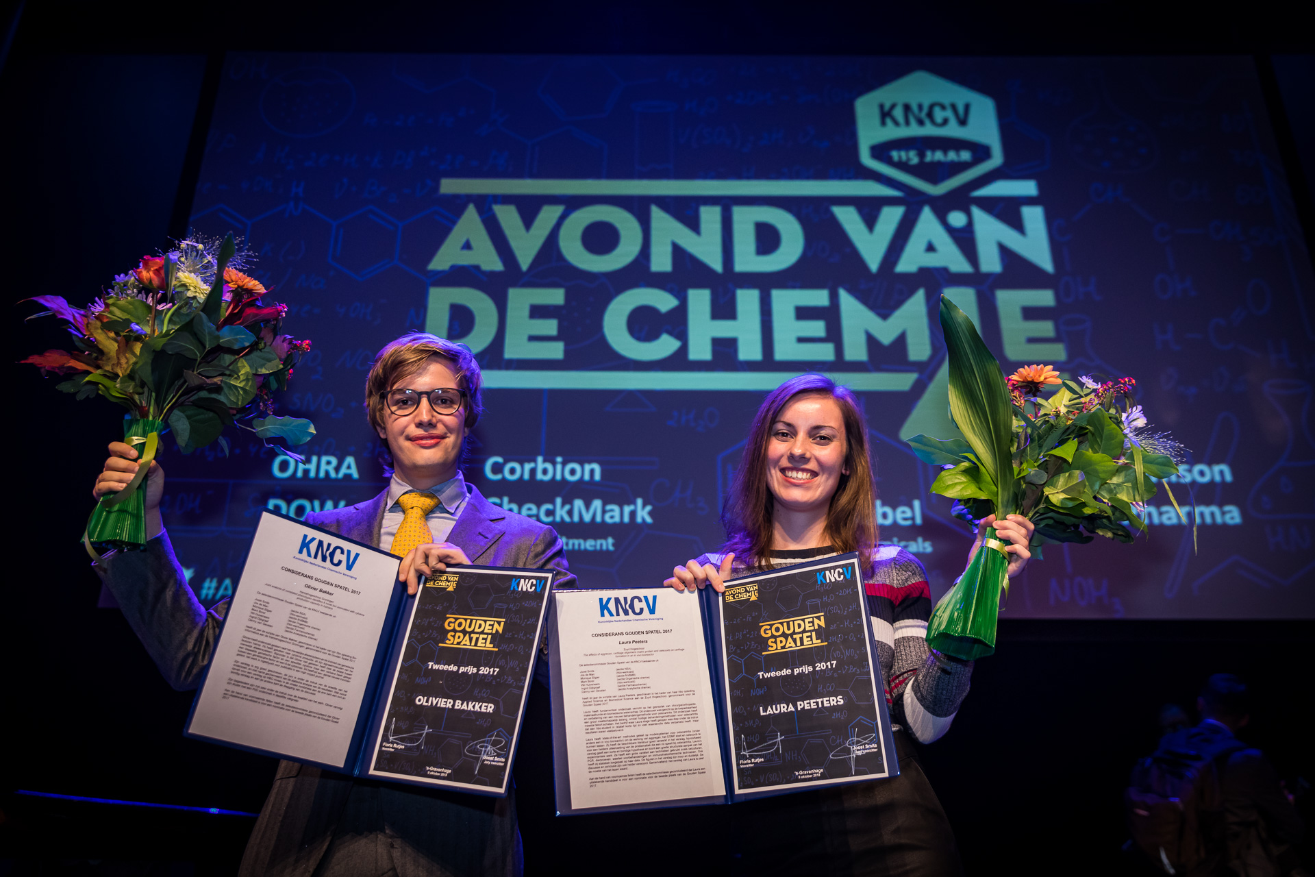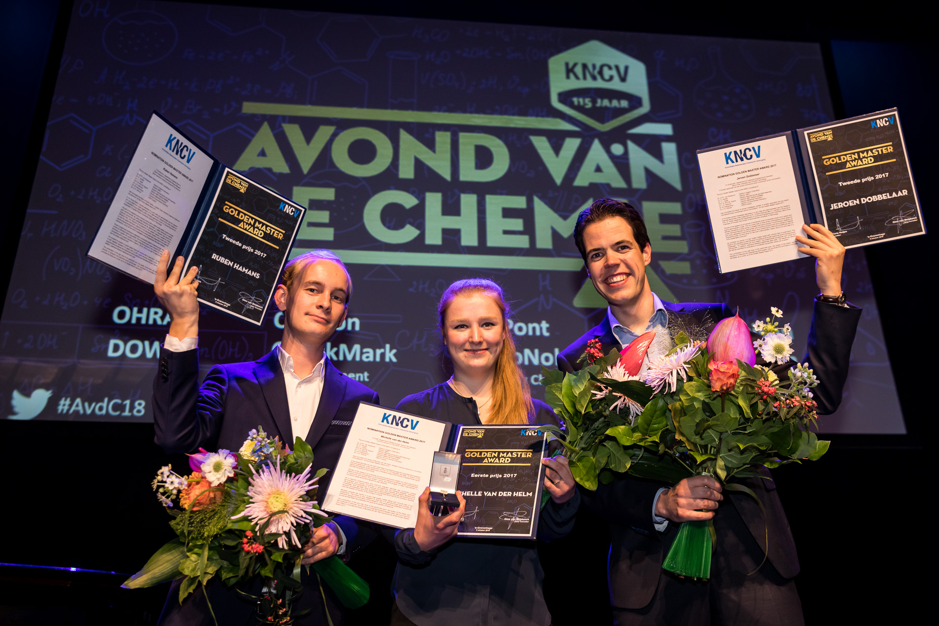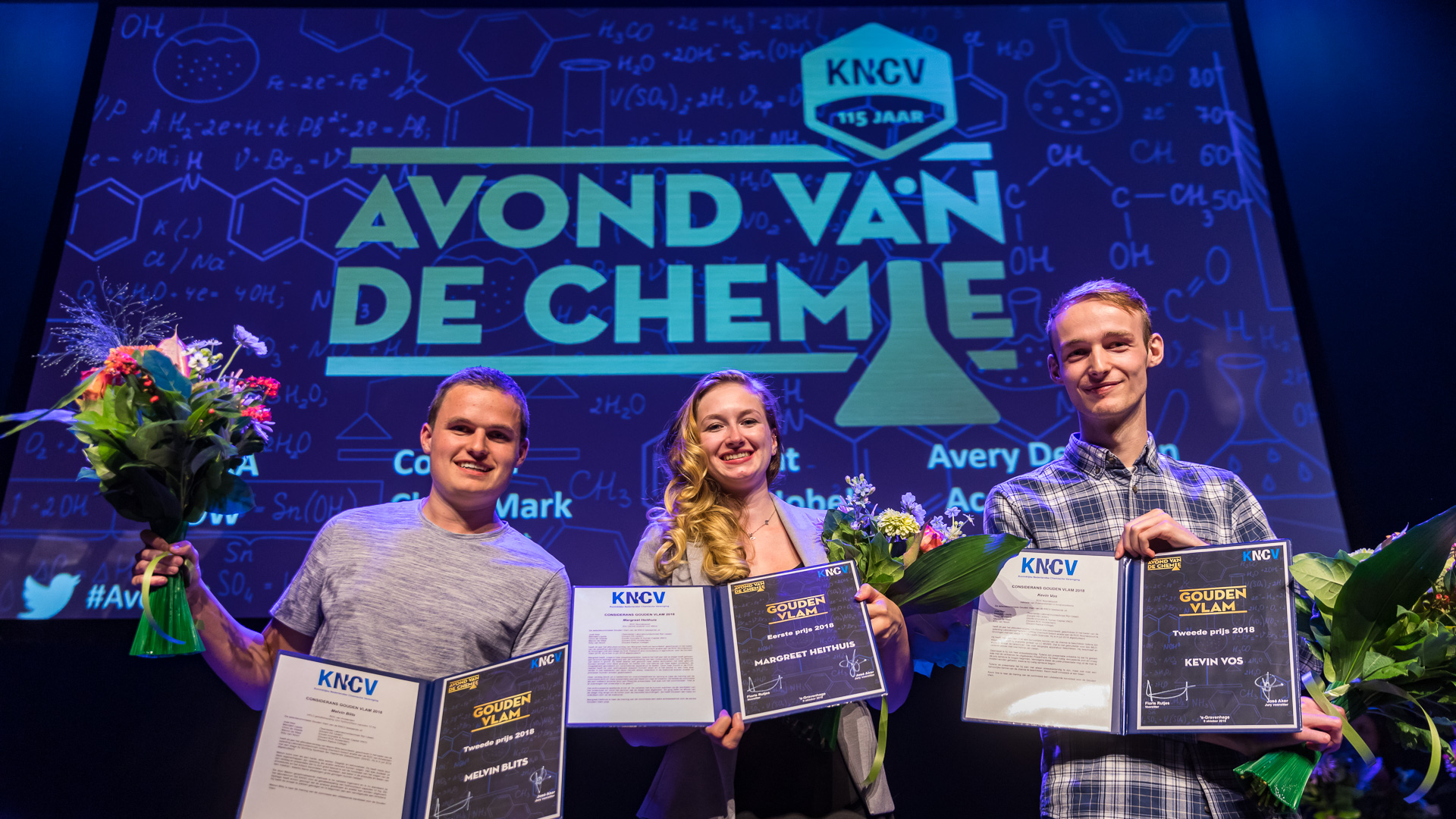 woensdag 10 oktober 2018 11:26 Tijdens de Avond van de Chemie op 9 oktober heeft de KNCV een aantal scriptieprijzen uitgedeeld aan talentvolle studenten. De Gouden Vlam ging naar Margreet Heithuis, de Gouden Spatel werd gewonnen door Pascalle van Eijck en Michelle van der Helm ging met de Golden Master Award naar huis.