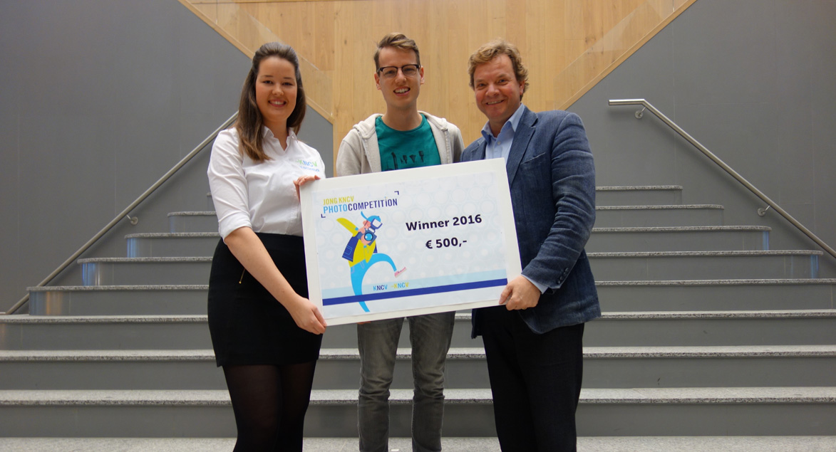 donderdag 22 december 2016 11:45 De Jong KNCV Fotocompetitie 2016 is gewonnen door Bas Buise, masterstudent aan de TU Delft. Zijn foto van de meer controversiële kant van chemie kreeg op CHAINS 2016 de meeste stemmen van de bezoekers. KNCV-directeur Jan-Willem Toering en Jong KNCV-bestuurslid Yacintha Vermeer reikten donderdag de cheque ter waarde van 500 euro uit aan de winnende fotograaf.