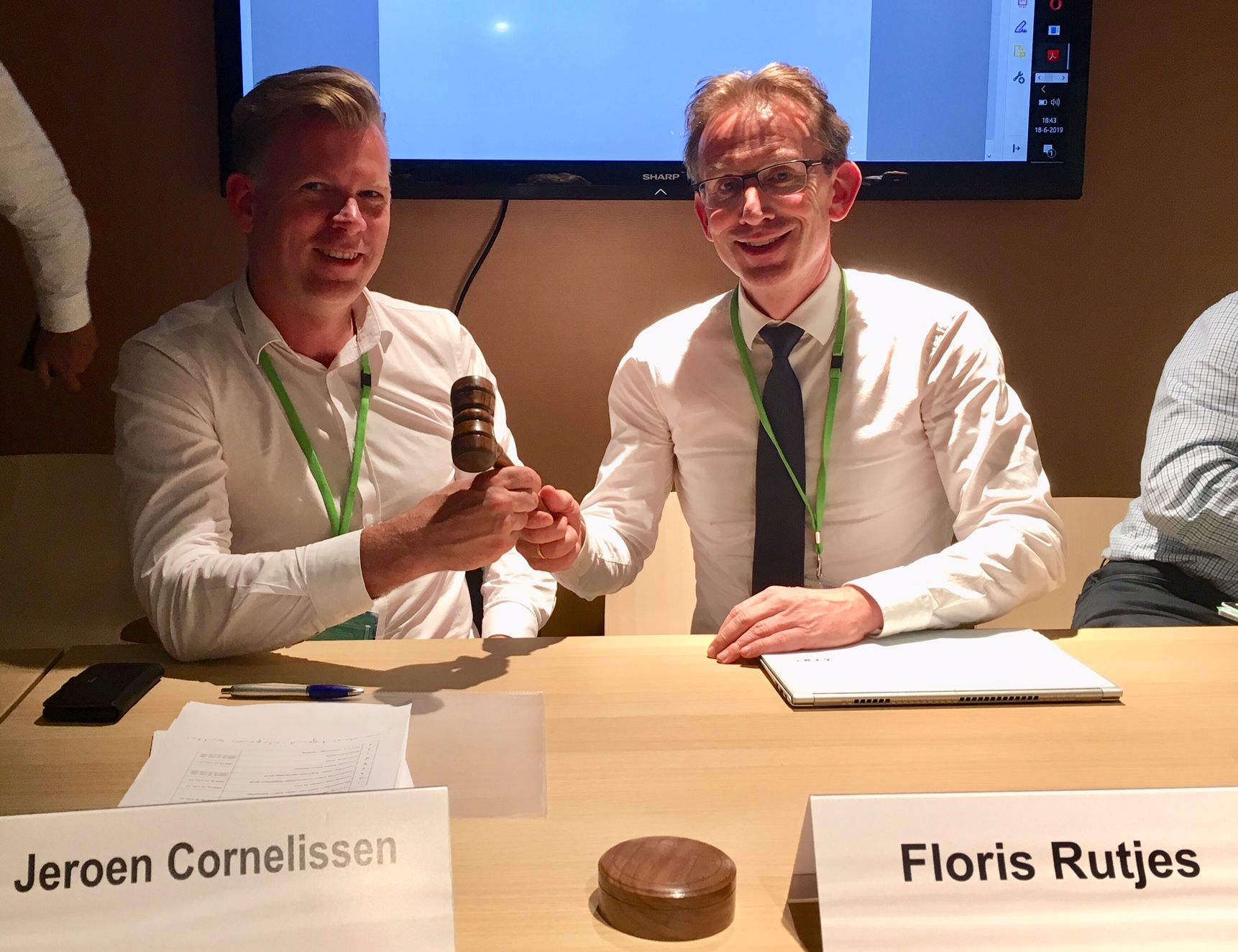 Aansluitend aan de onthulling van het Chemisch Erfgoed was de Algemene Ledenvergadering. Hier vond ook een belangrijke gebeurtenis plaats, namelijk de overdracht van het voorzitterschap. Floris Rutjes gaf na drie jaar de voorzittershamer over aan Jeroen Cornelissen. Floris zal nog in het bestuur actief blijven als past-president.