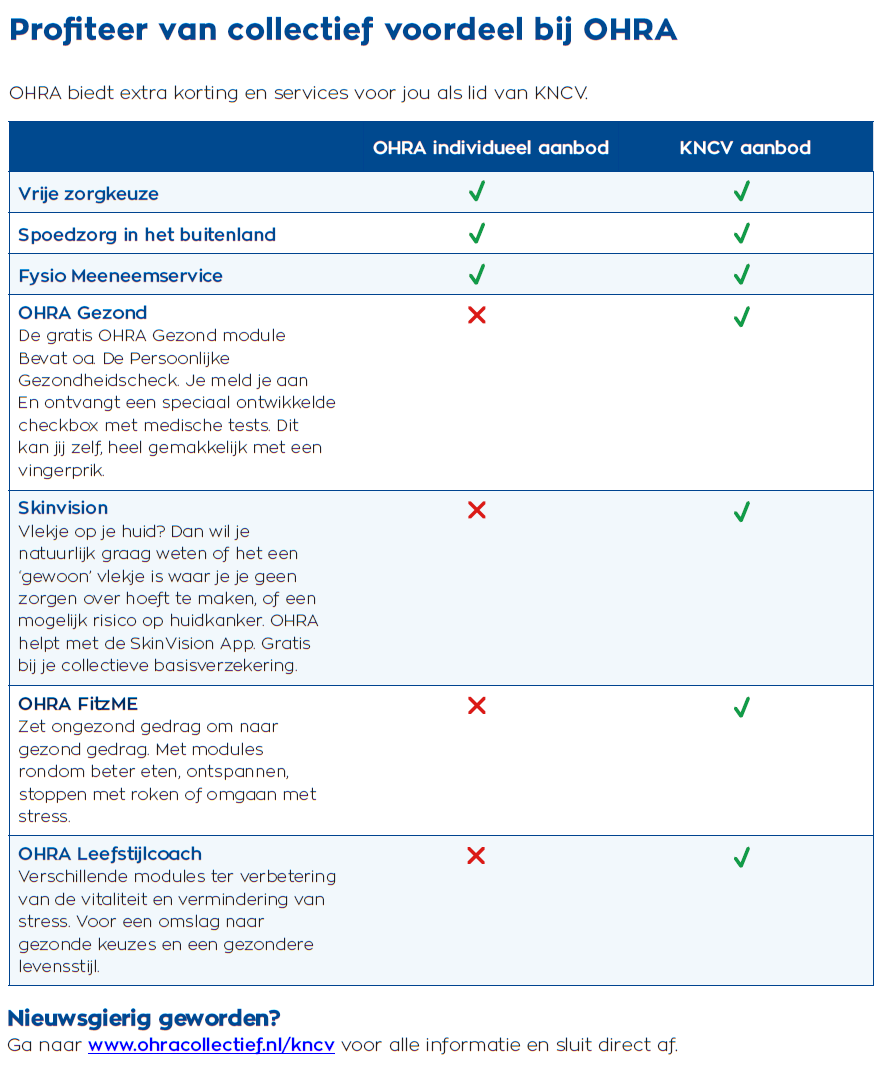 Wil je meer weten over de collectieve zorgverzekering van OHRA, je premie berekenen of deze direct afsluiten? Ga naar: www.ohracollectief.nl/kncv