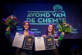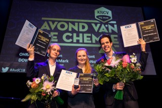woensdag 10 oktober 2018 11:26             Tijdens de Avond van de Chemie op 9 oktober heeft de KNCV een aantal scriptieprijzen uitgedeeld aan talentvolle studenten. De Gouden Vlam ging naar Margreet Heithuis, de Gouden Spatel werd gewonnen door Pascalle van Eijck en Michelle van der Helm ging met de Golden Master Award naar huis.